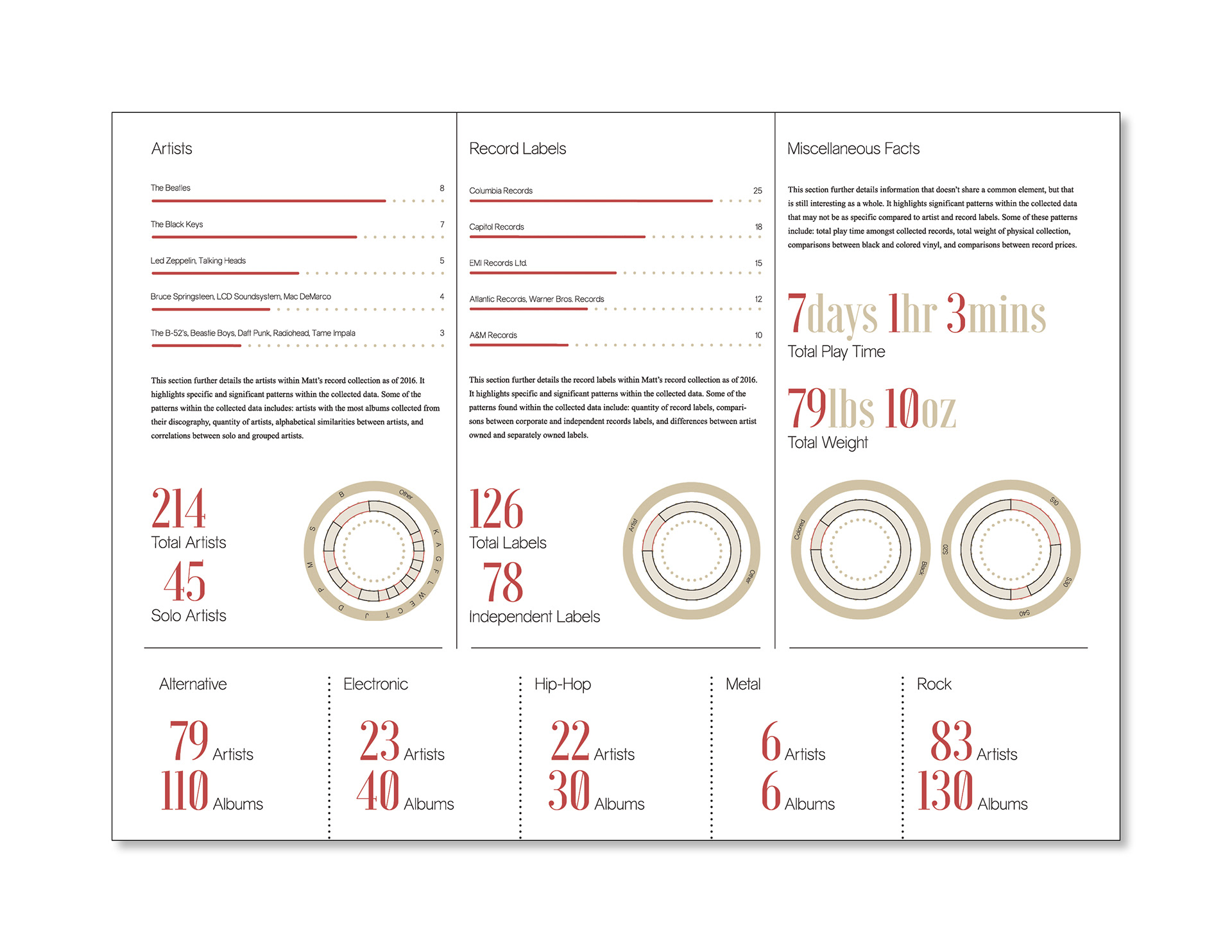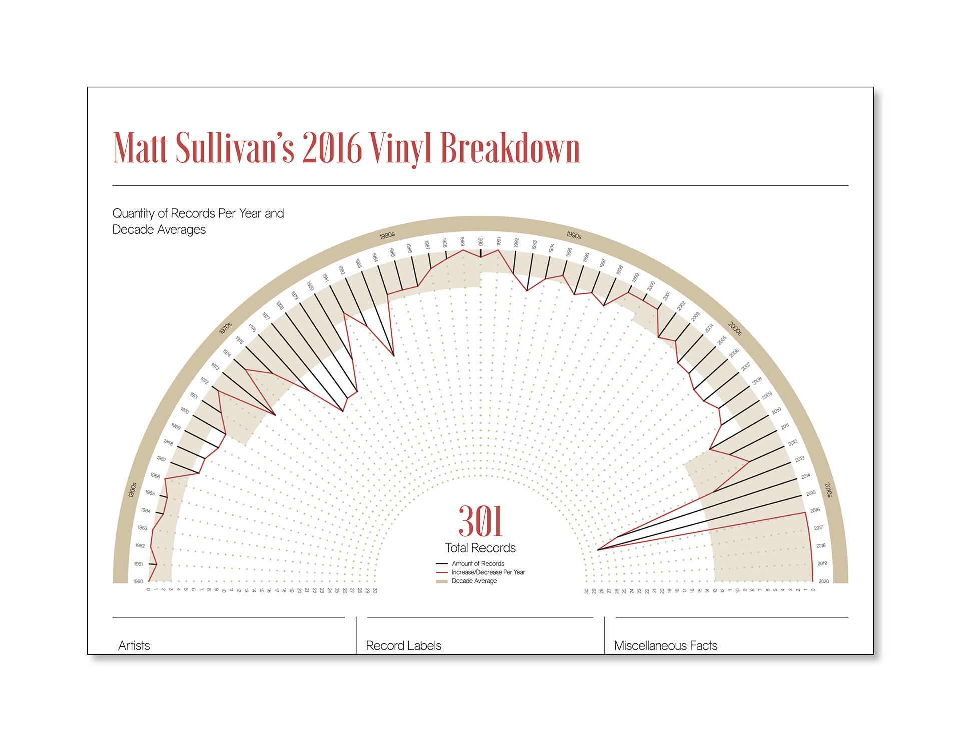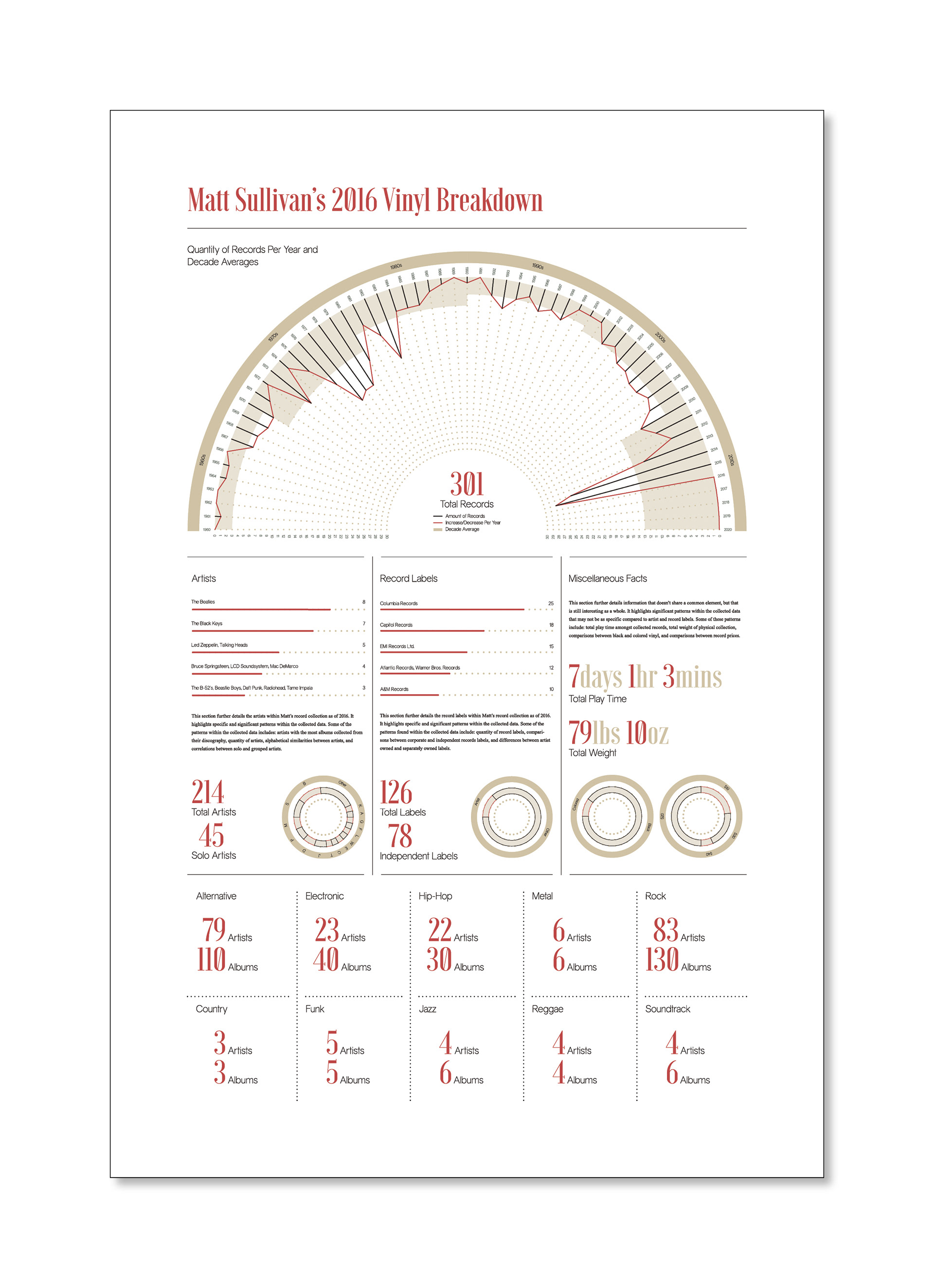 Here's my Infographic Poster detailing my ever-increasing record collection as of the end of 2016. This is part of the largest and most challenging projects for my senior Typography class, and I'm extremely proud to say that I earned a 100% grade on this project. Here's the project description: "Design and produce a 24” x 36” type dominated poster that shows a glimpse of your personality to the viewer. You must use two or more colors and must consider the suggestions and restrictions below. Interests can include: hobbies, vacations, family, music, movies, recipes, books, sports, culture, etc. You must include at least one of the following: fever chart, bar chart, pie chart, and table." Don't forget to follow, appreciate, leave feedback, and share this project with your family and friends.