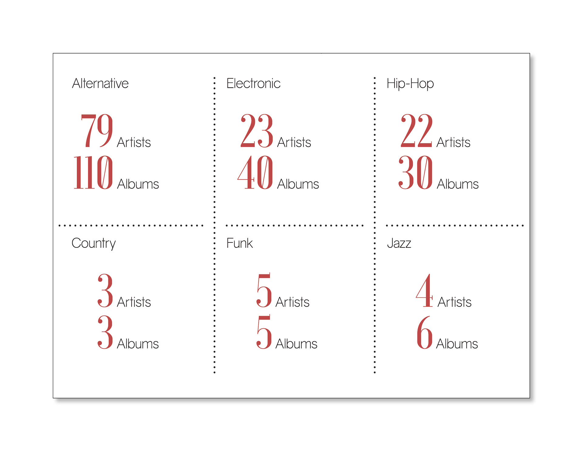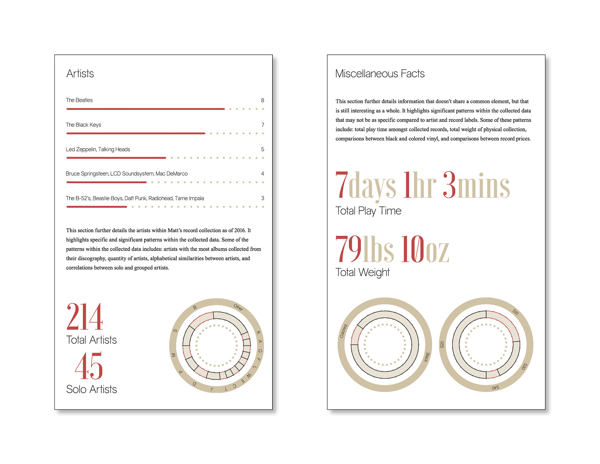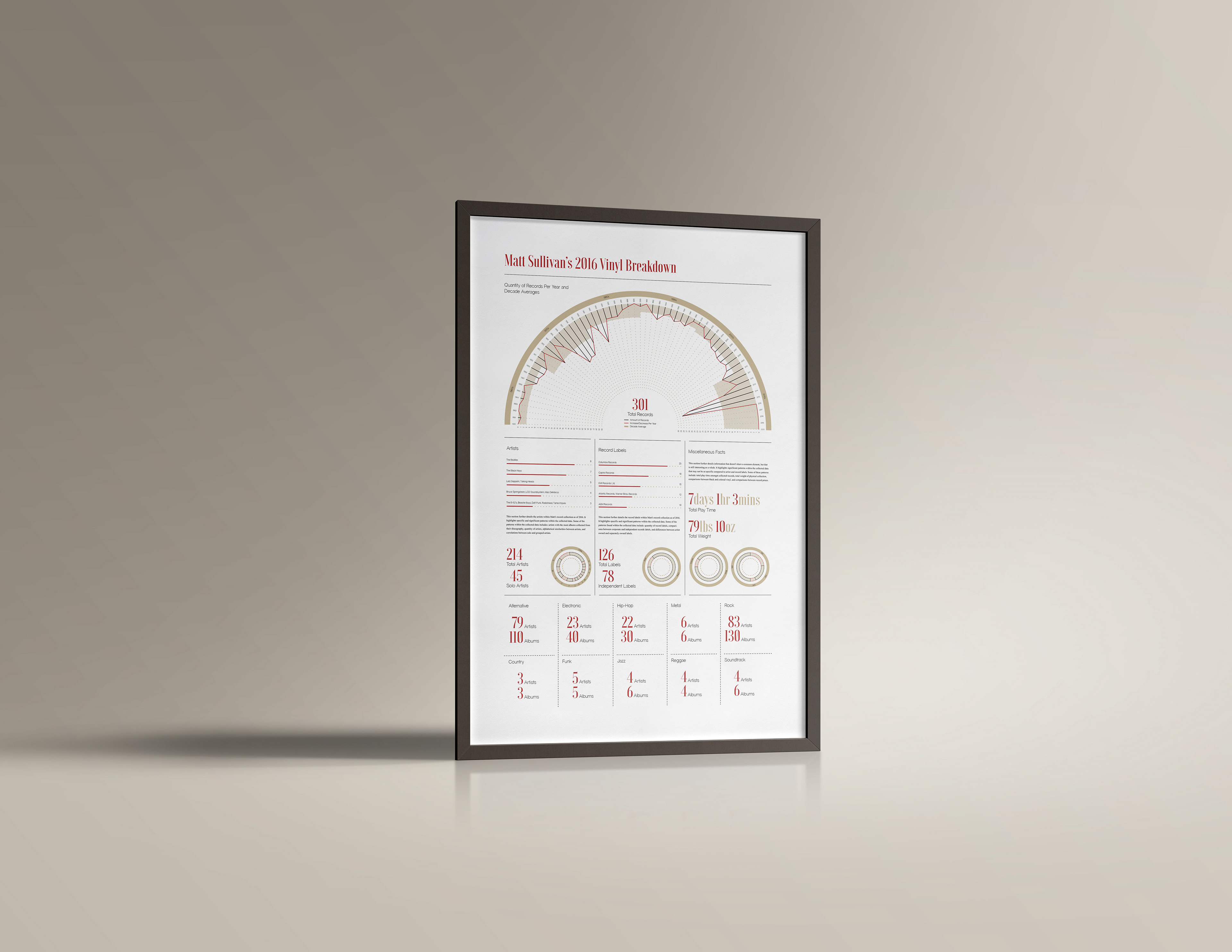Here's my Infographic Poster detailing my ever-increasing record collection as of the end of 2016. This is part of the largest and most challenging projects for my senior Typography class, and I'm extremely proud to say that I earned a 100% grade on this project. Here's the project description: "Design and produce a 24” x 36” type dominated poster that shows a glimpse of your personality to the viewer. You must use two or more colors and must consider the suggestions and restrictions below. Interests can include: hobbies, vacations, family, music, movies, recipes, books, sports, culture, etc. You must include at least one of the following: fever chart, bar chart, pie chart, and table." Don't forget to follow, appreciate, leave feedback, and share this project with your family and friends.